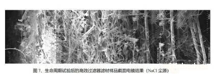 针对上述的试验尘源问题,使用改进后的钠焰法试验尘可以较好的解决,通过使用中效过滤器筛选方式获取的固体试验粉尘在粒径分布特征上与高效过滤器实际处理粉尘一致,较为容易获得用户以及生产企业的认可,图7给出了使用上述尘源进行高效过滤器生命周期模拟试验后的过滤器滤材剖面电镜照片,照片显示的由过滤器迎风面至滤材内部不同深度(由左至右)的粉尘堆积情况,由照片可见,尽管大多数粉尘仍主要堆积在滤材表层及浅层结构,但在滤材内部仍存在不同程度的粉尘堆积现象,表明试验粉尘对于模拟深层过滤材料的全生命周期具有一定的科学合理性。