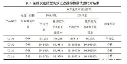 但近年来较多的试验研究表明,成品过滤器与滤材试验一样,在完好并且不存在局部漏泄缺陷的情况下,随着风量的降低其效率升高,试验风量降低50%时,其效率测试结果上升接近1个9,因此,对于完好过滤器,其20%风量下的效率试验结果相比100%风量应升高约2个9,而对于有漏点的过滤器,其20%风量下的效率试验结果与100%风量下试验结果相当,见表3所给出某批次密摺型高效过滤器的检漏试验比对结果。